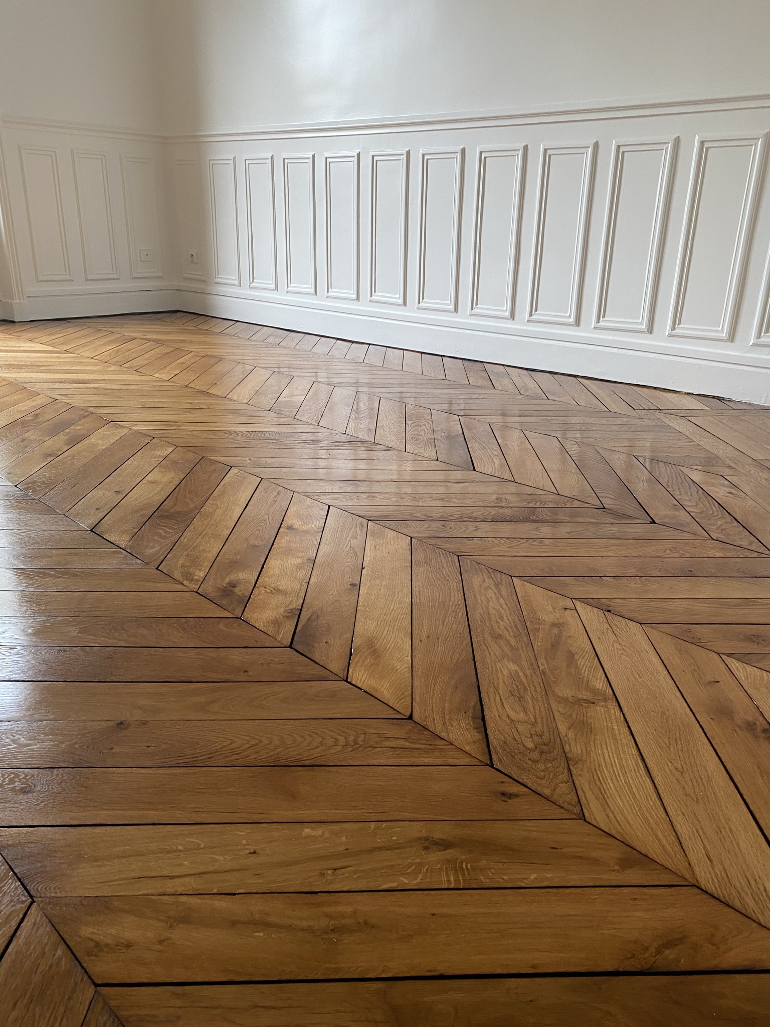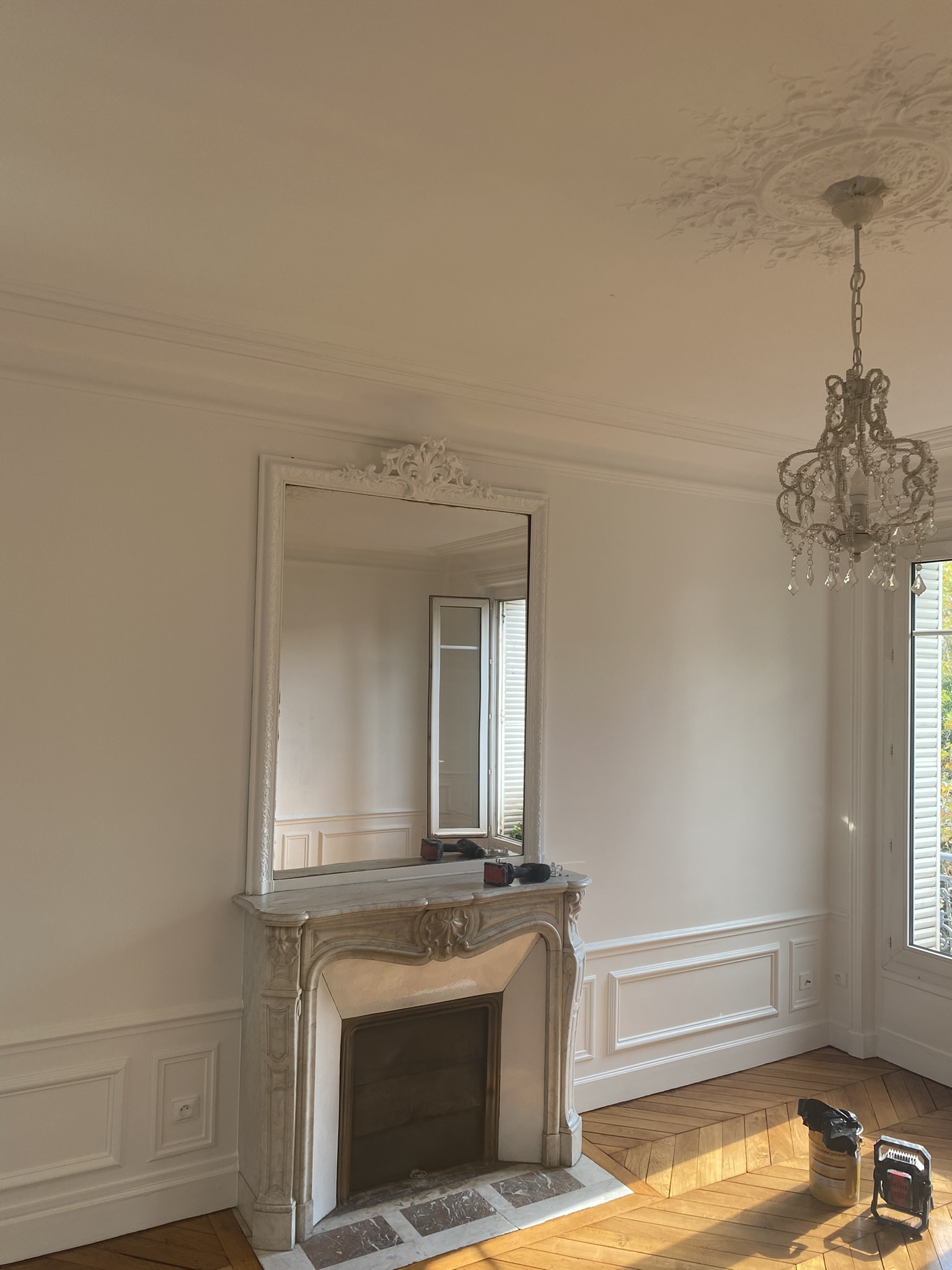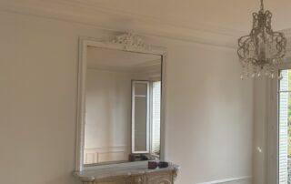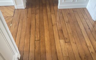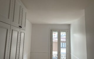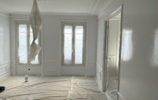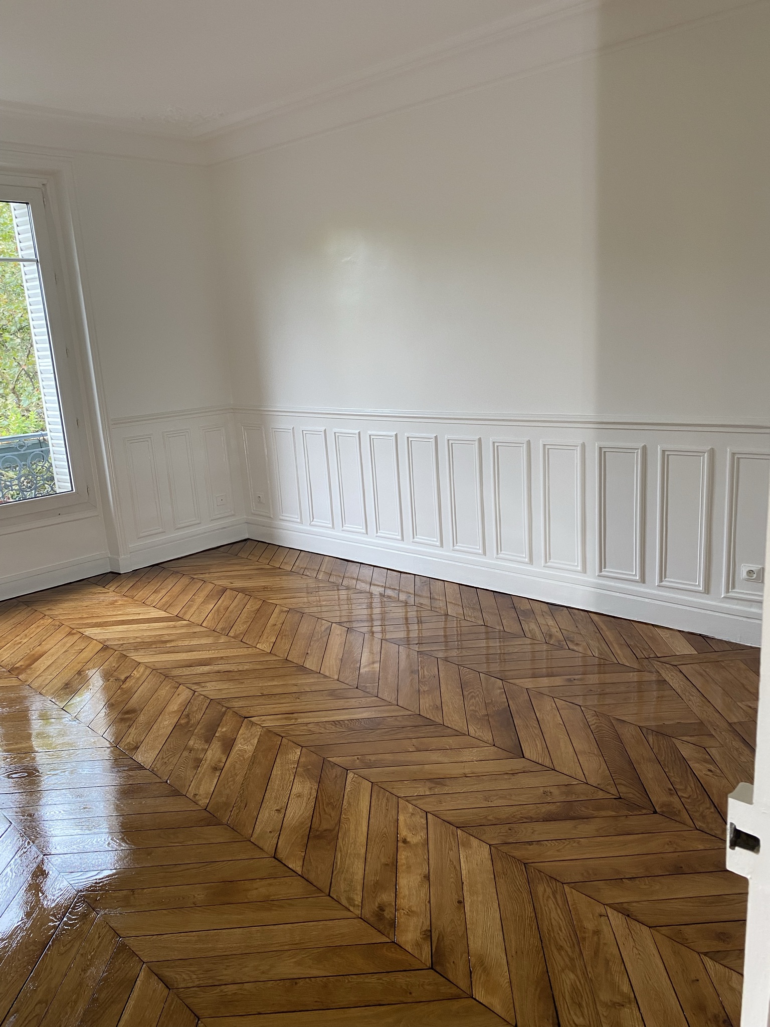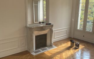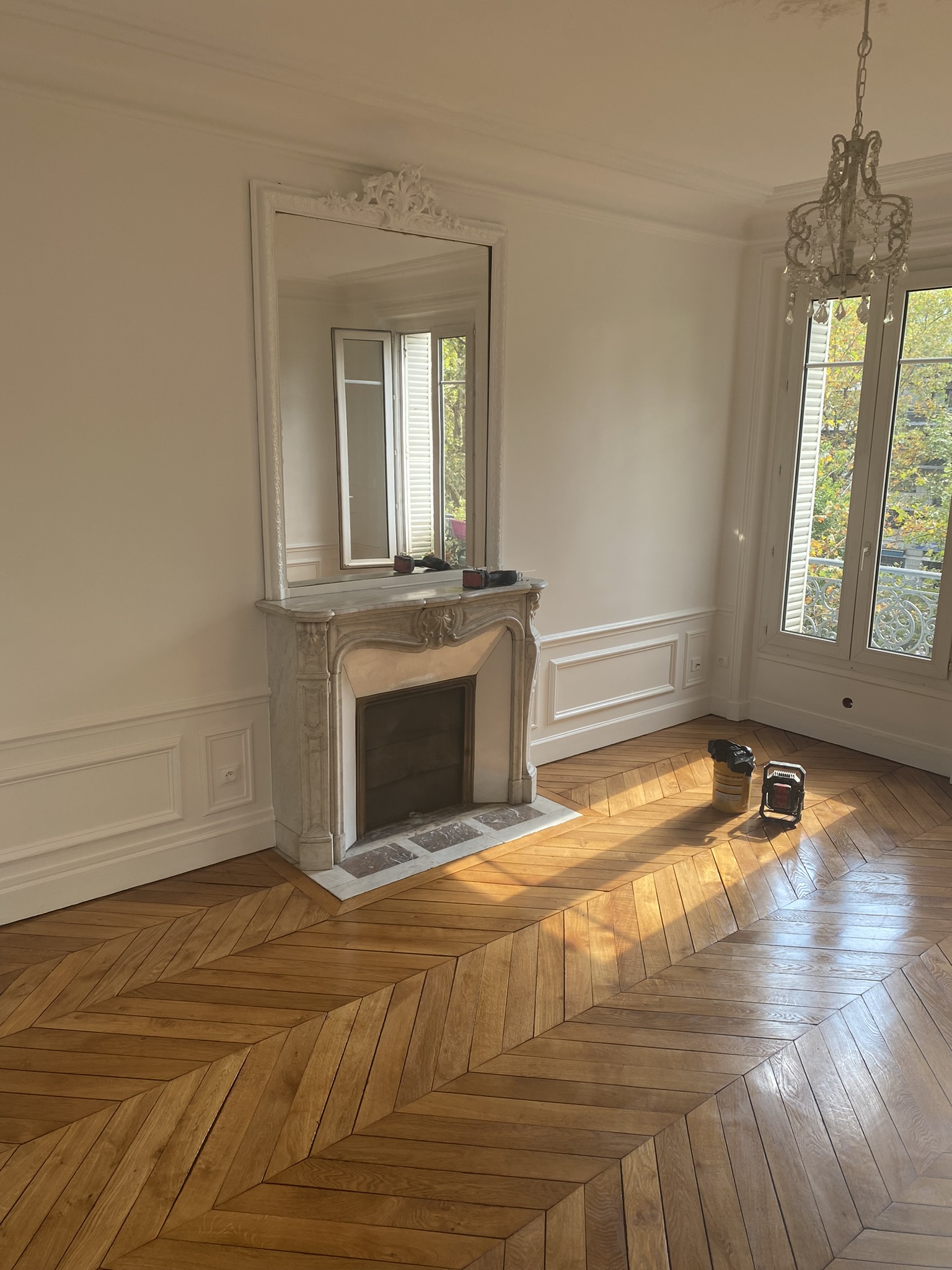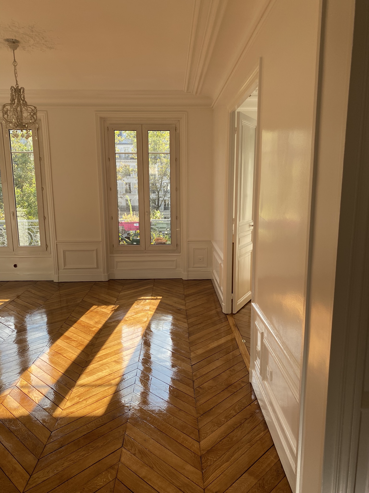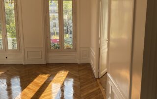 Dans cet appartement haussmannien de 80 m2, les deux points d’orgue de la réfection ont été d’une part la restauration du parquet sur lambourdes, le ponçage puis le vernissage et d’autre part la rénovation des murs (rebouchage, tissu de rénovation, enduit, peinture).