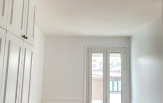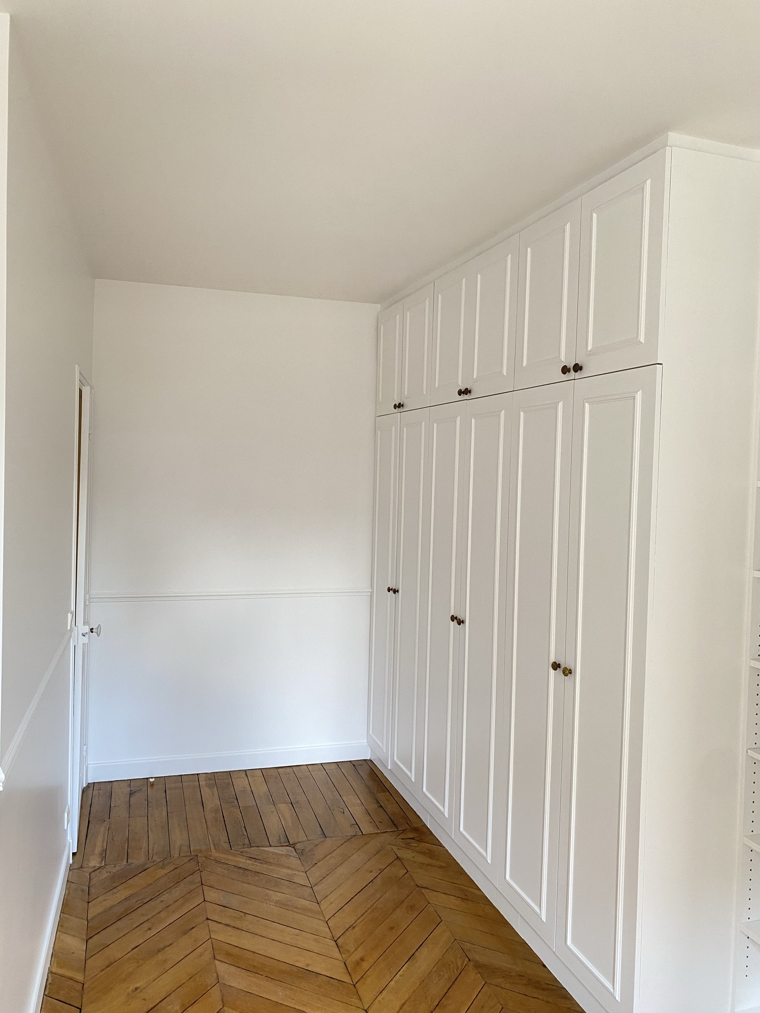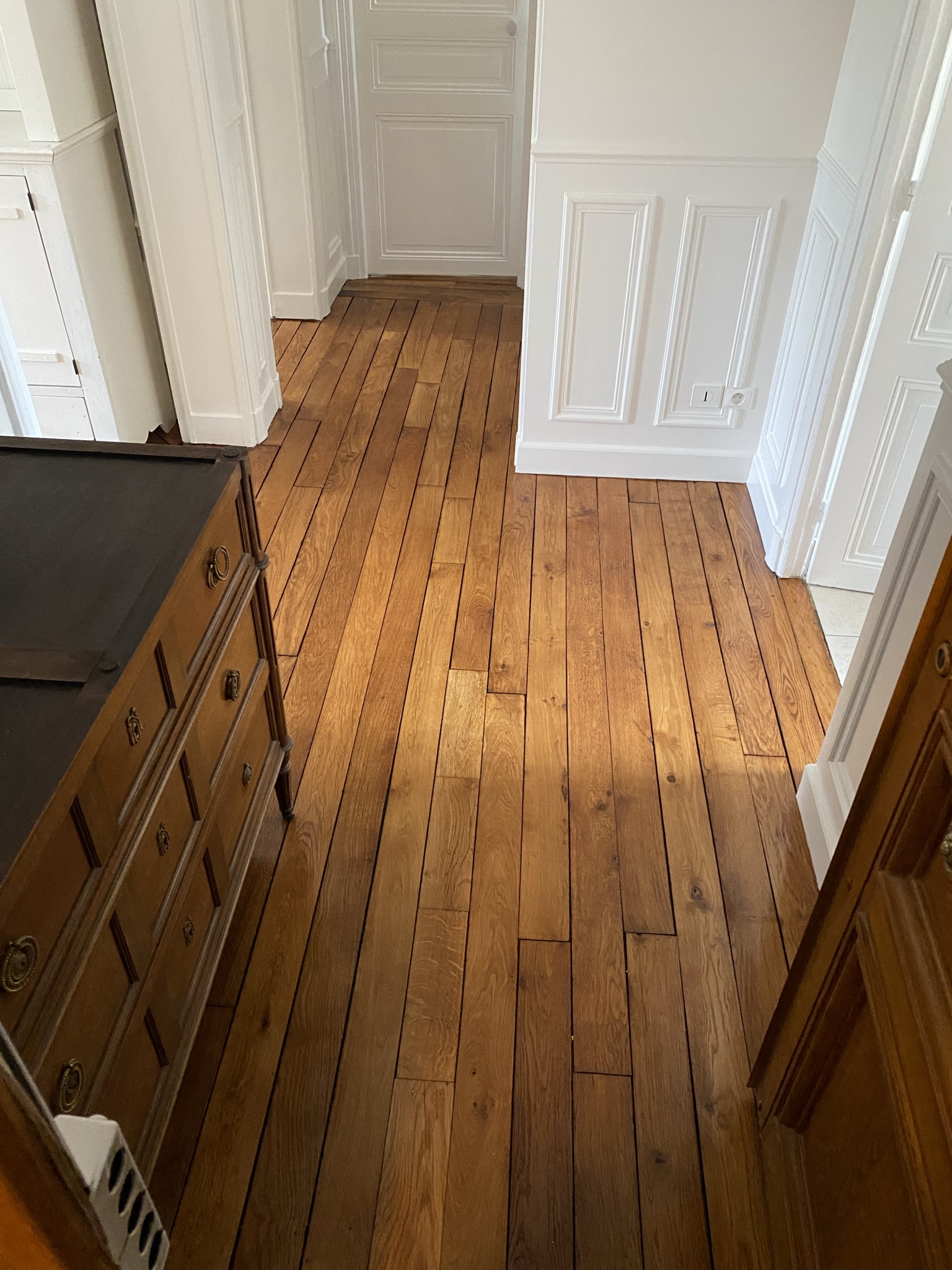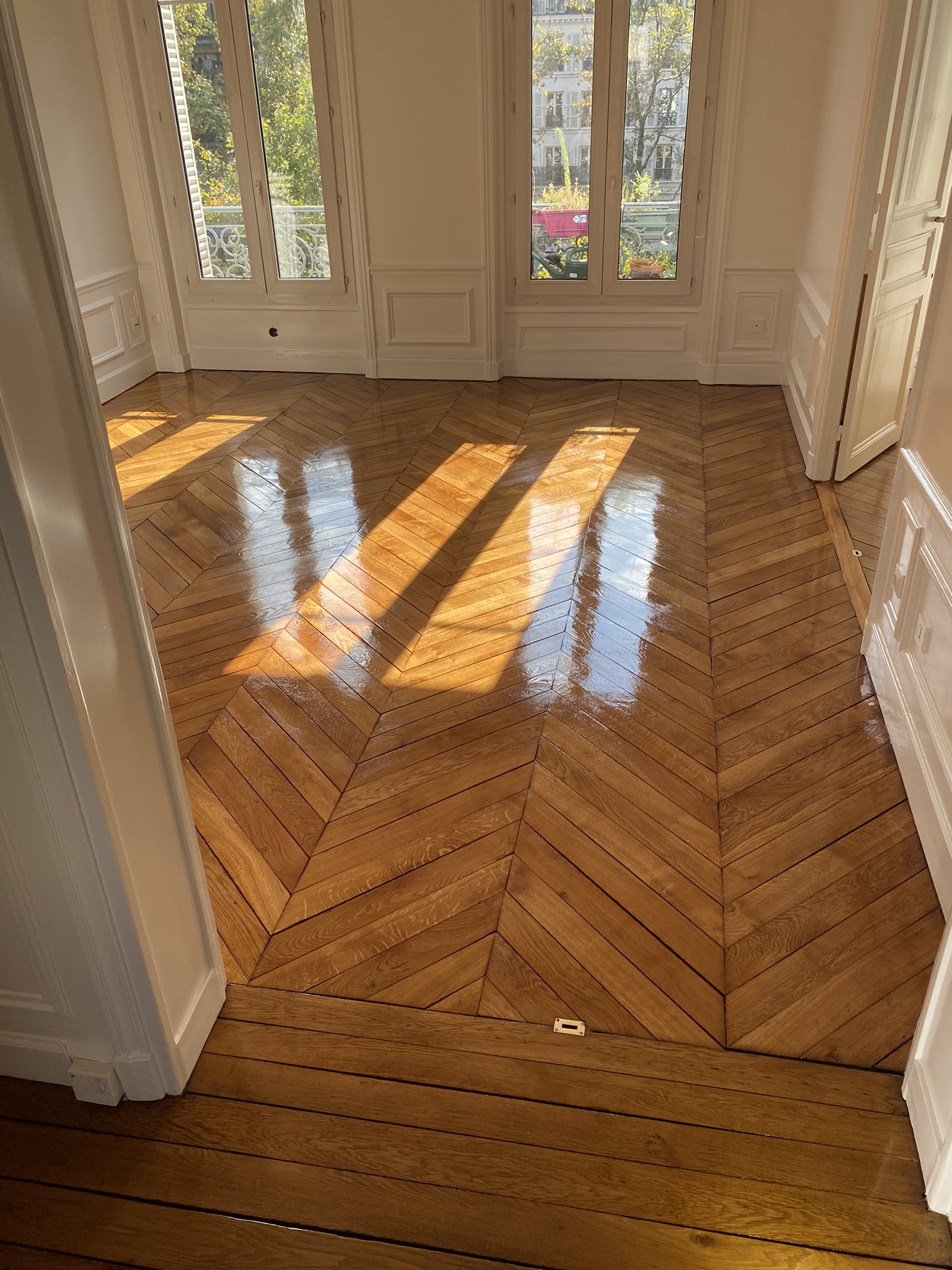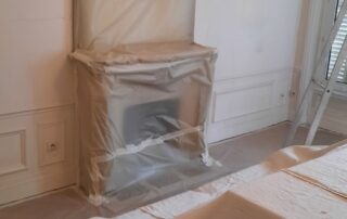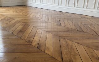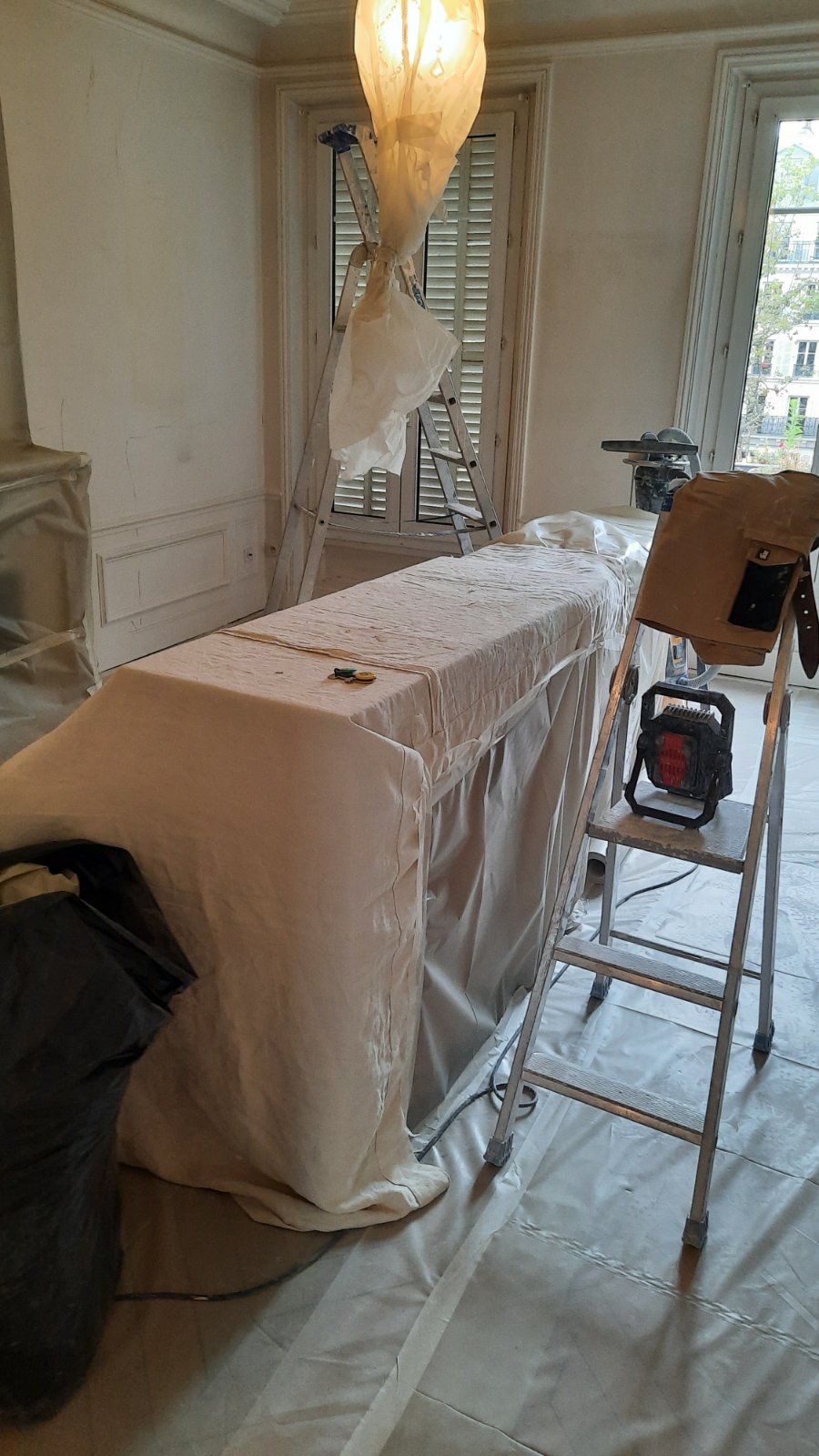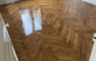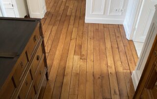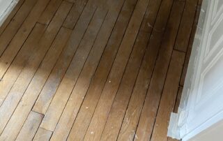 Dans cet appartement haussmannien de 80 m2, les deux points d’orgue de la réfection ont été d’une part la restauration du parquet sur lambourdes, le ponçage puis le vernissage et d’autre part la rénovation des murs (rebouchage, tissu de rénovation, enduit, peinture).