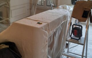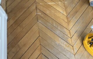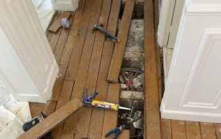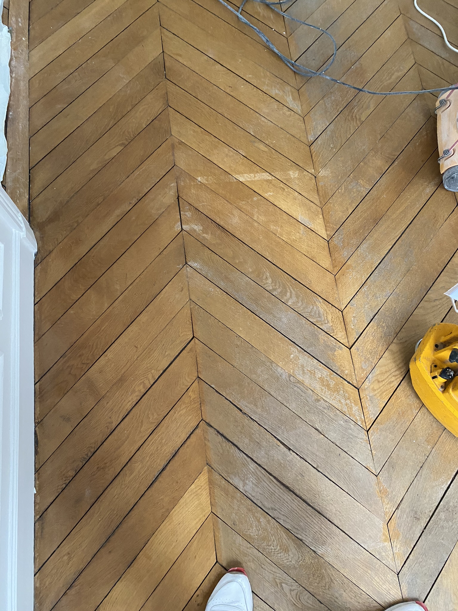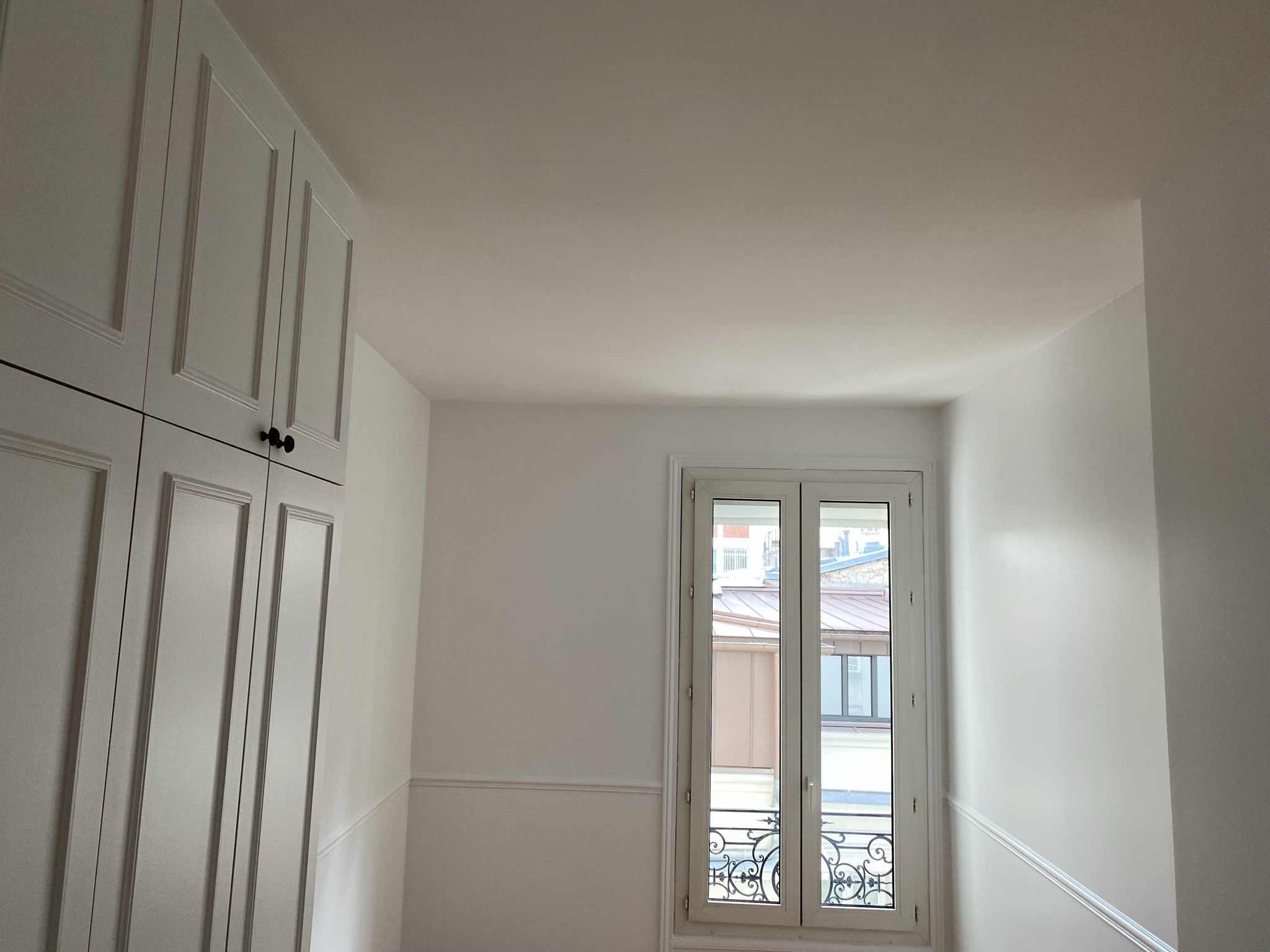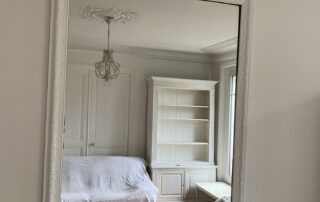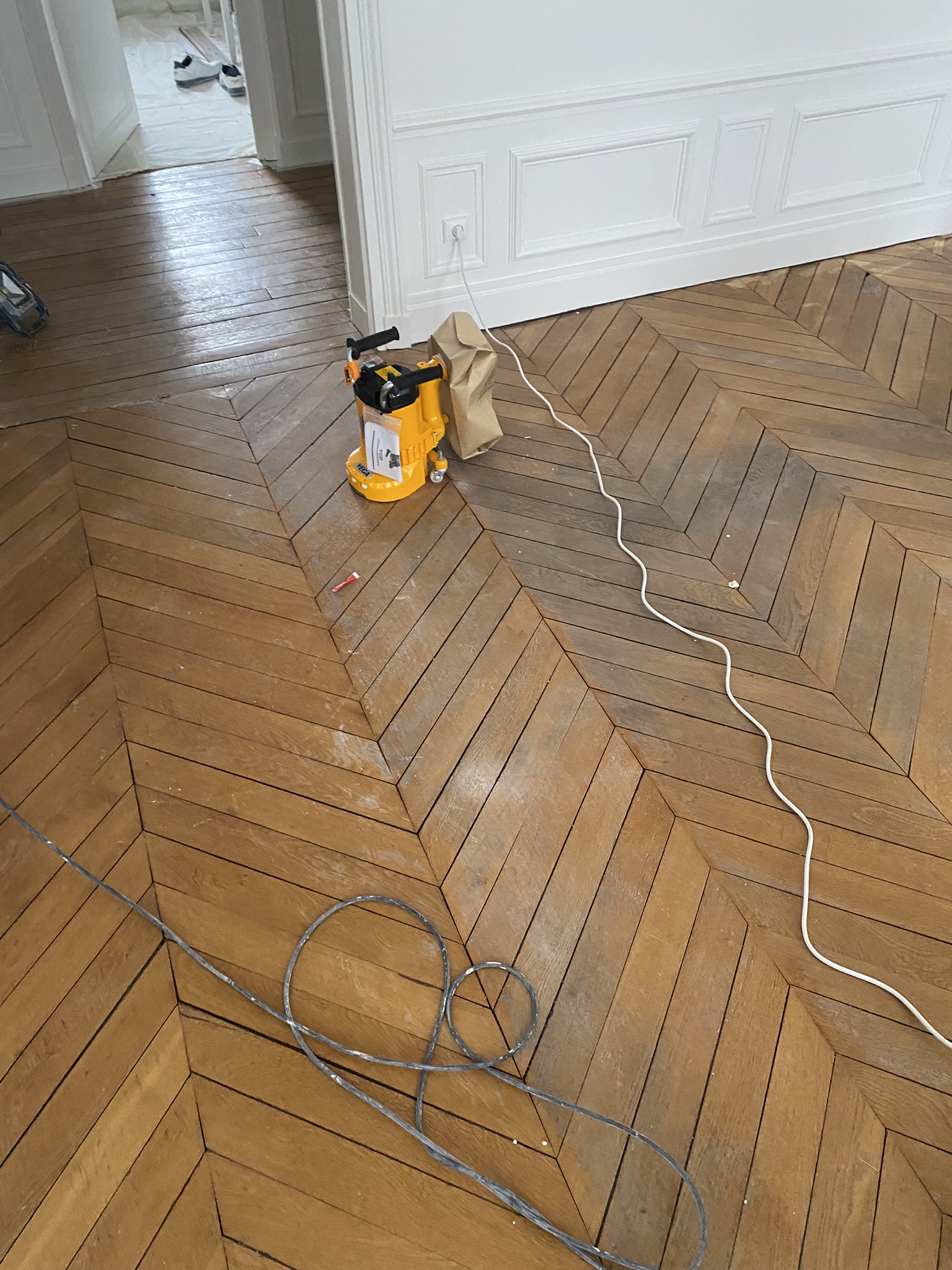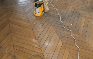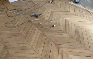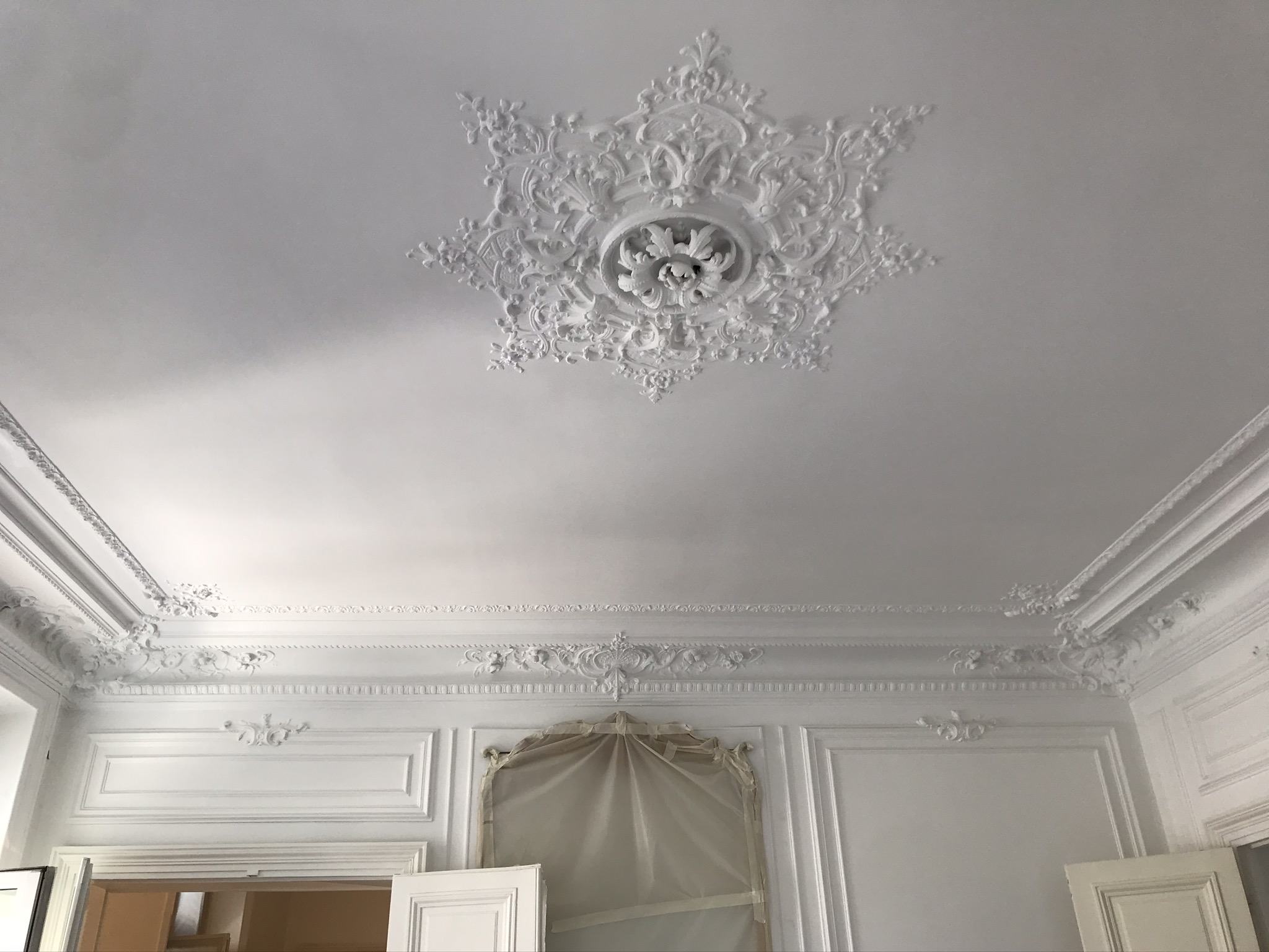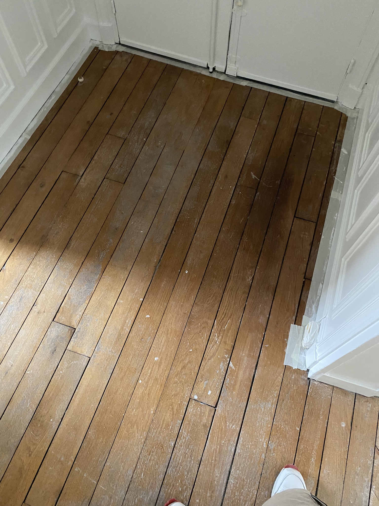 Dans cet appartement haussmannien de 80 m2, les deux points d’orgue de la réfection ont été d’une part la restauration du parquet sur lambourdes, le ponçage puis le vernissage et d’autre part la rénovation des murs (rebouchage, tissu de rénovation, enduit, peinture).