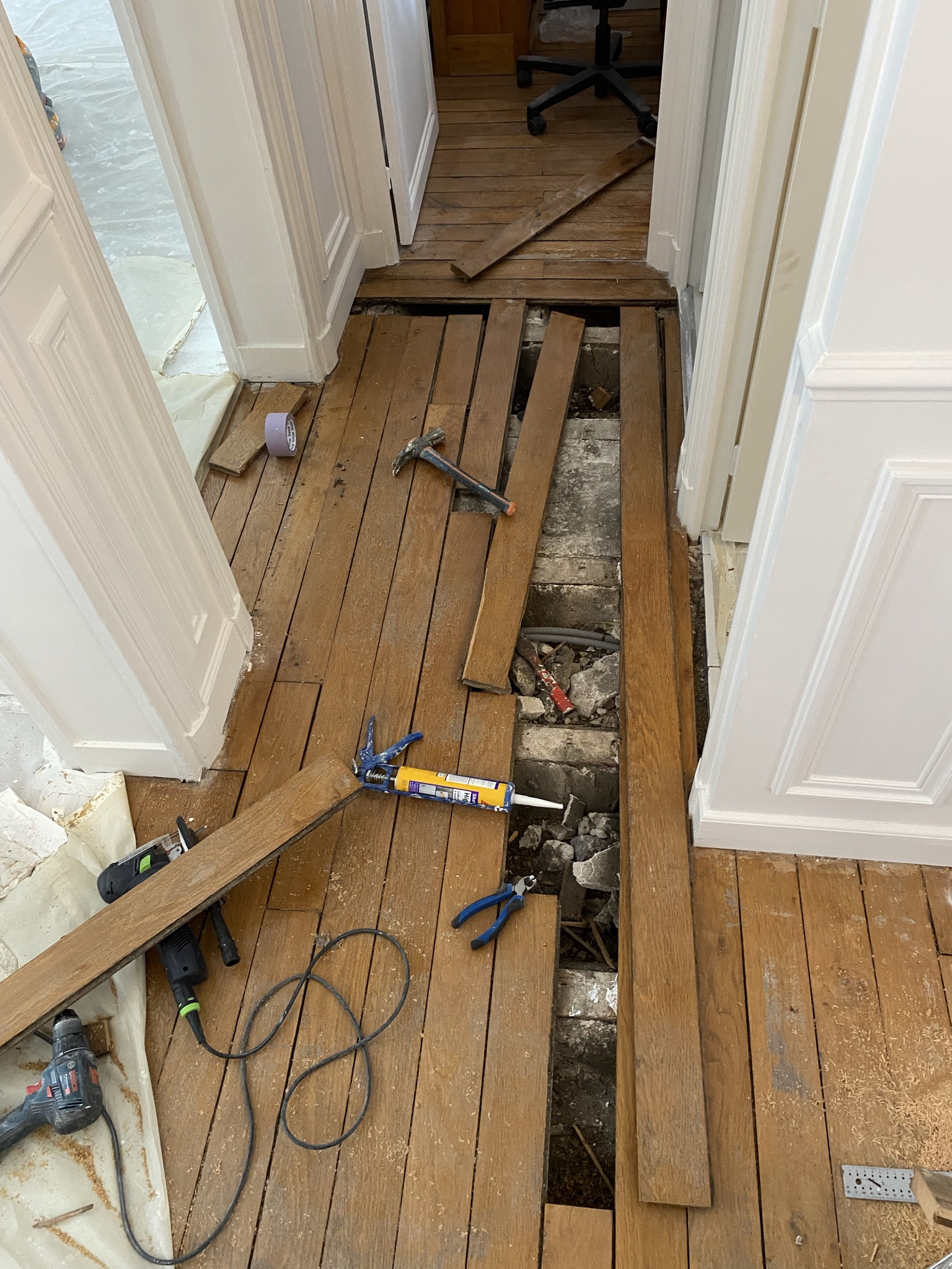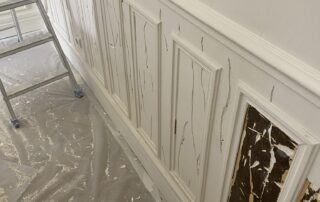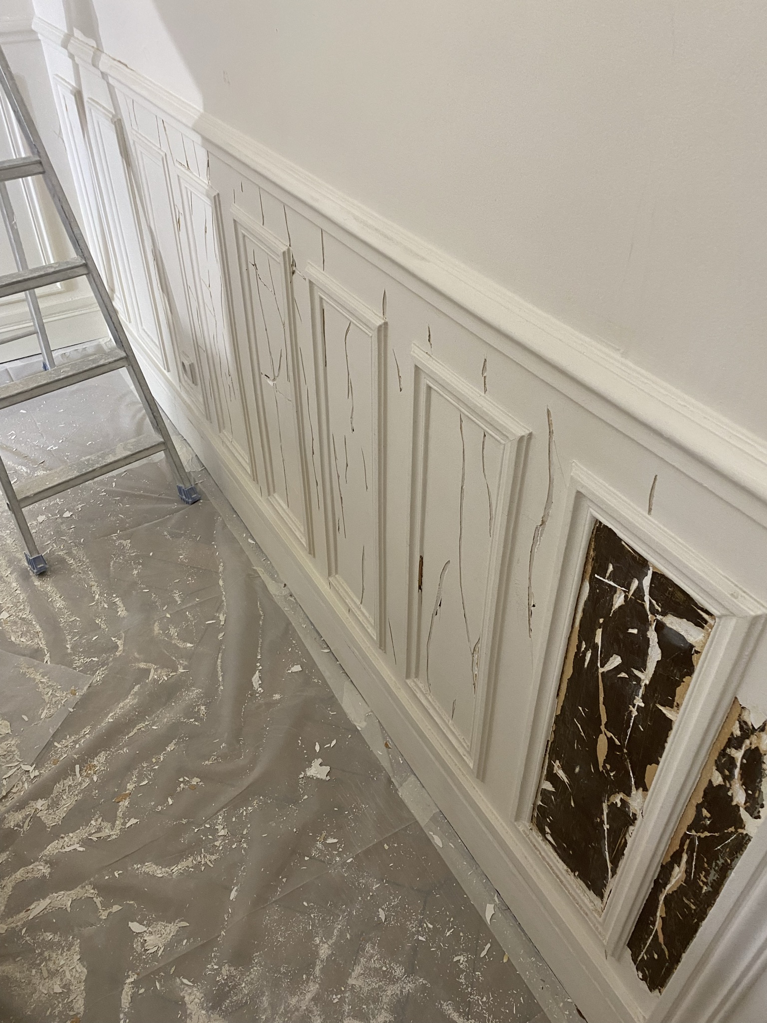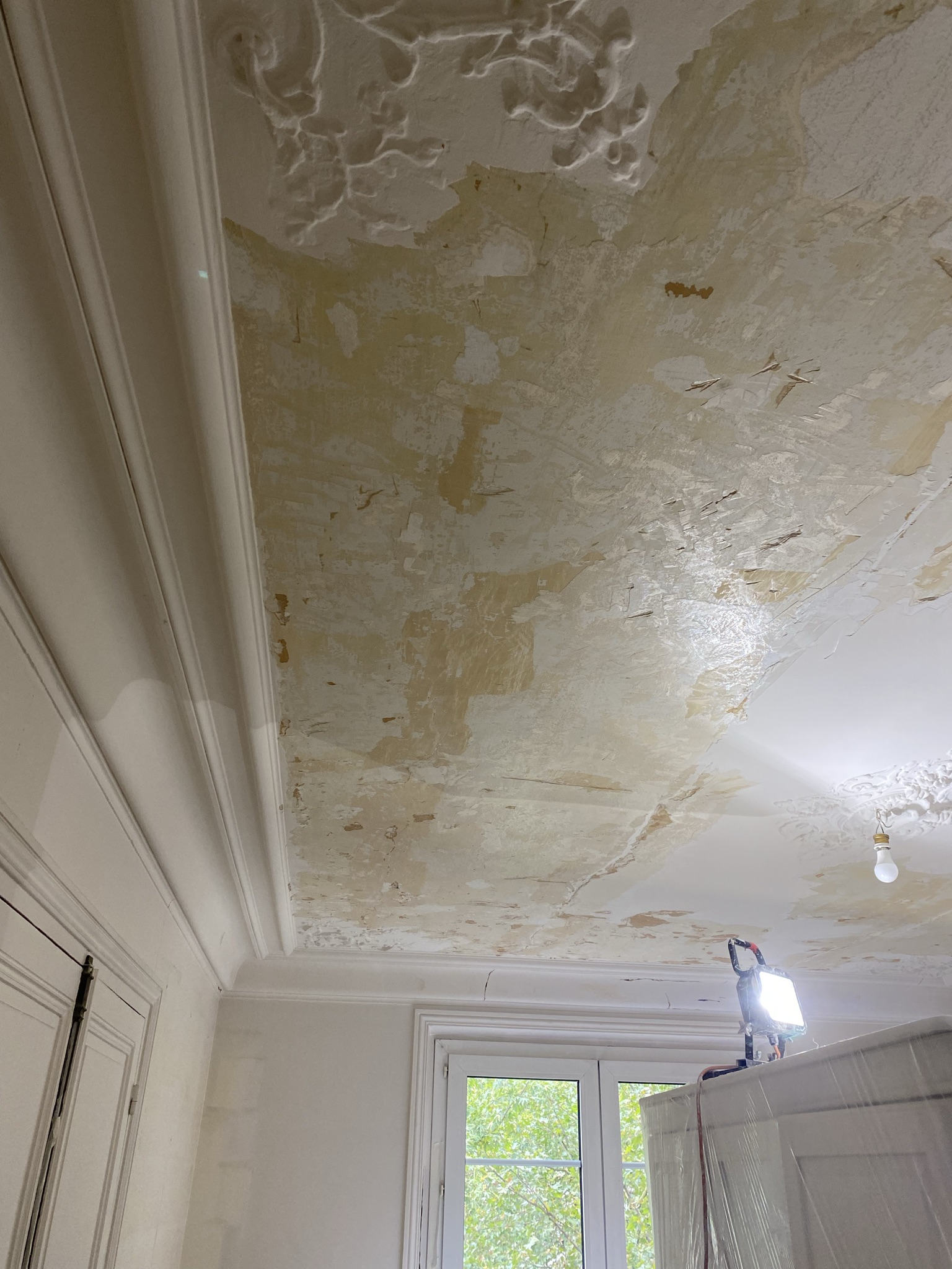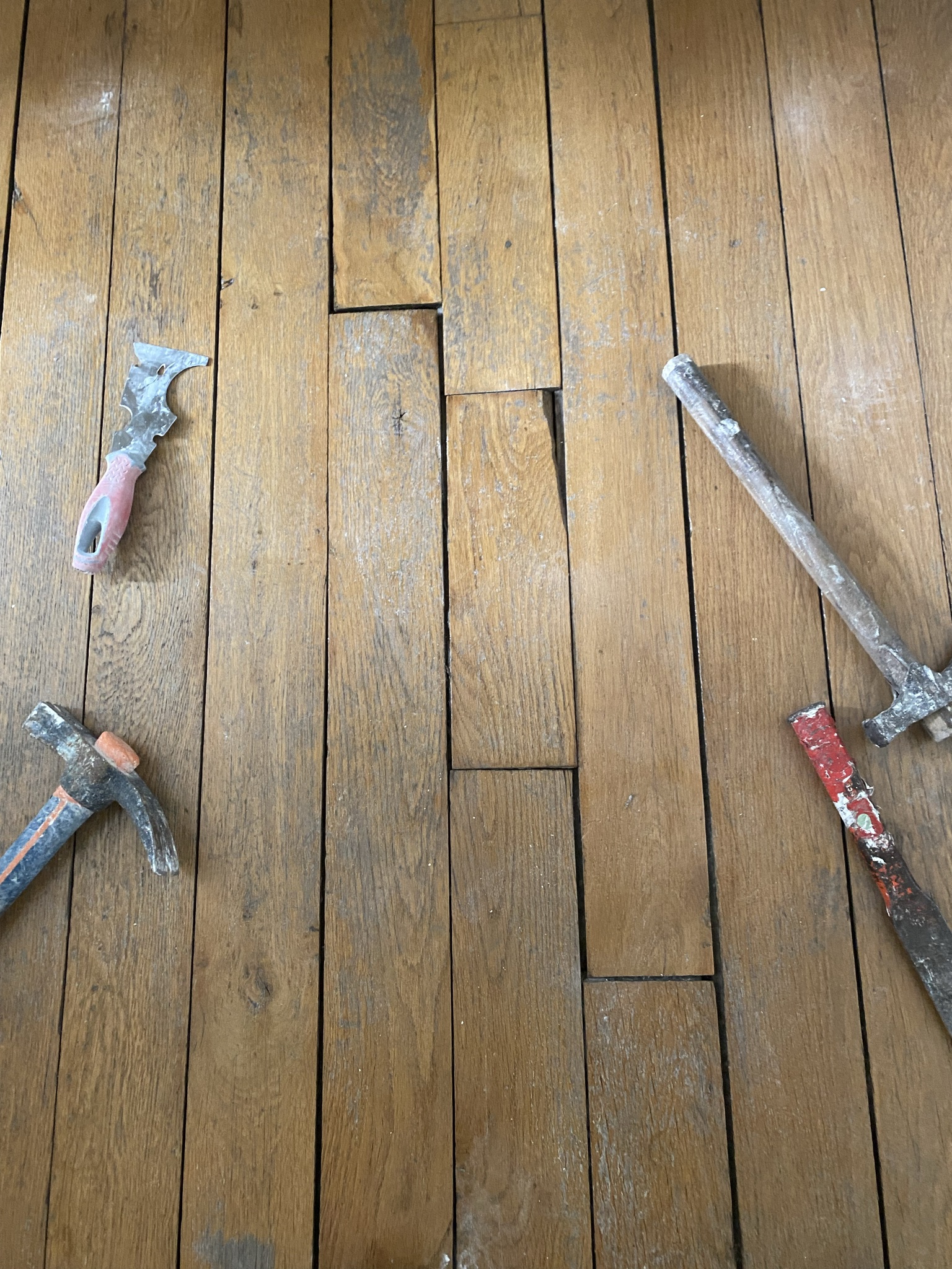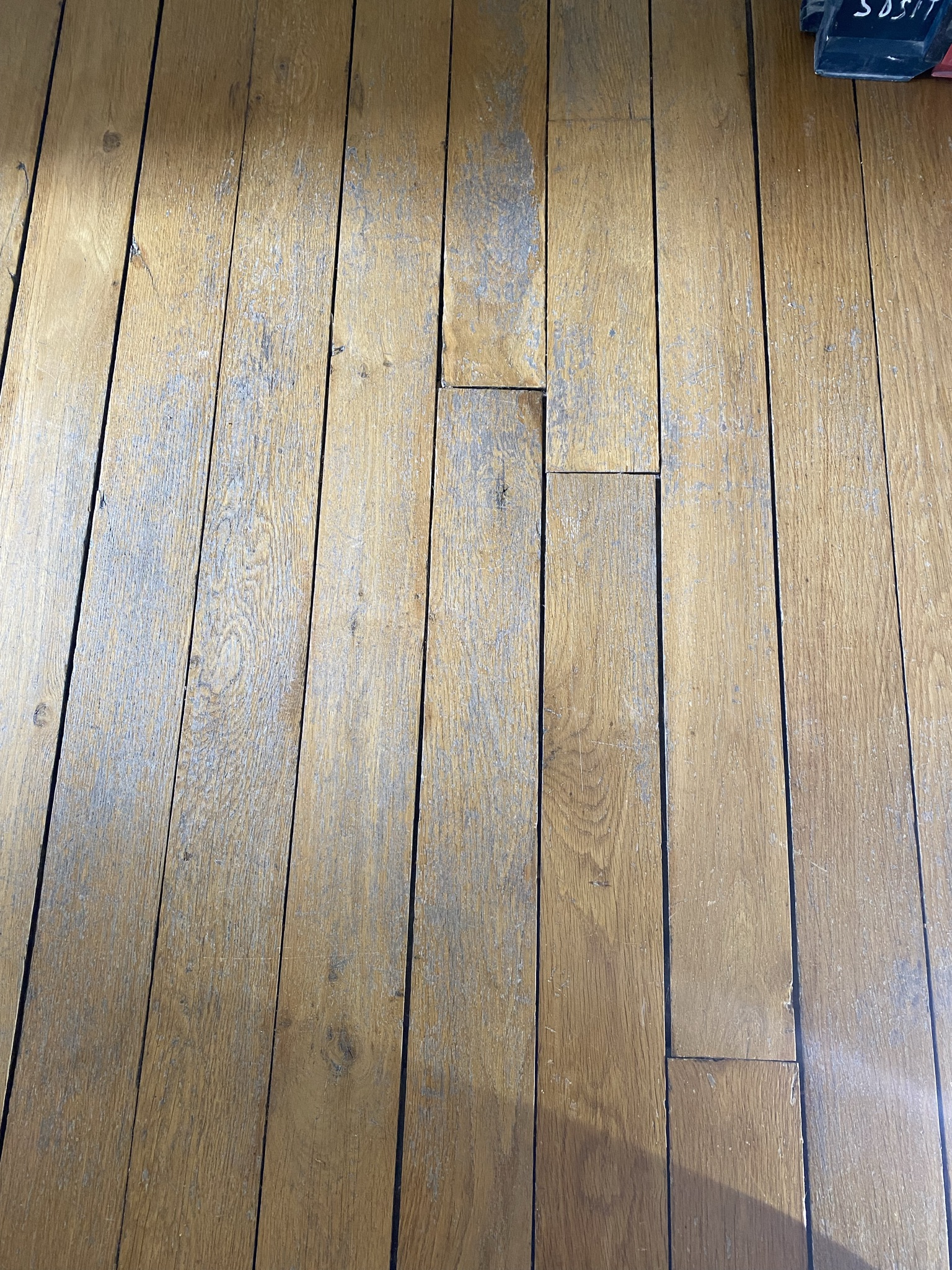 Dans cet appartement haussmannien de 80 m2, les deux points d’orgue de la réfection ont été d’une part la restauration du parquet sur lambourdes, le ponçage puis le vernissage et d’autre part la rénovation des murs (rebouchage, tissu de rénovation, enduit, peinture).